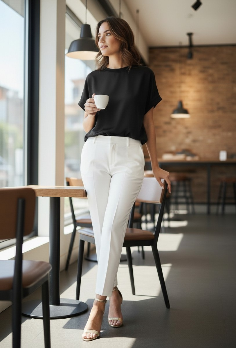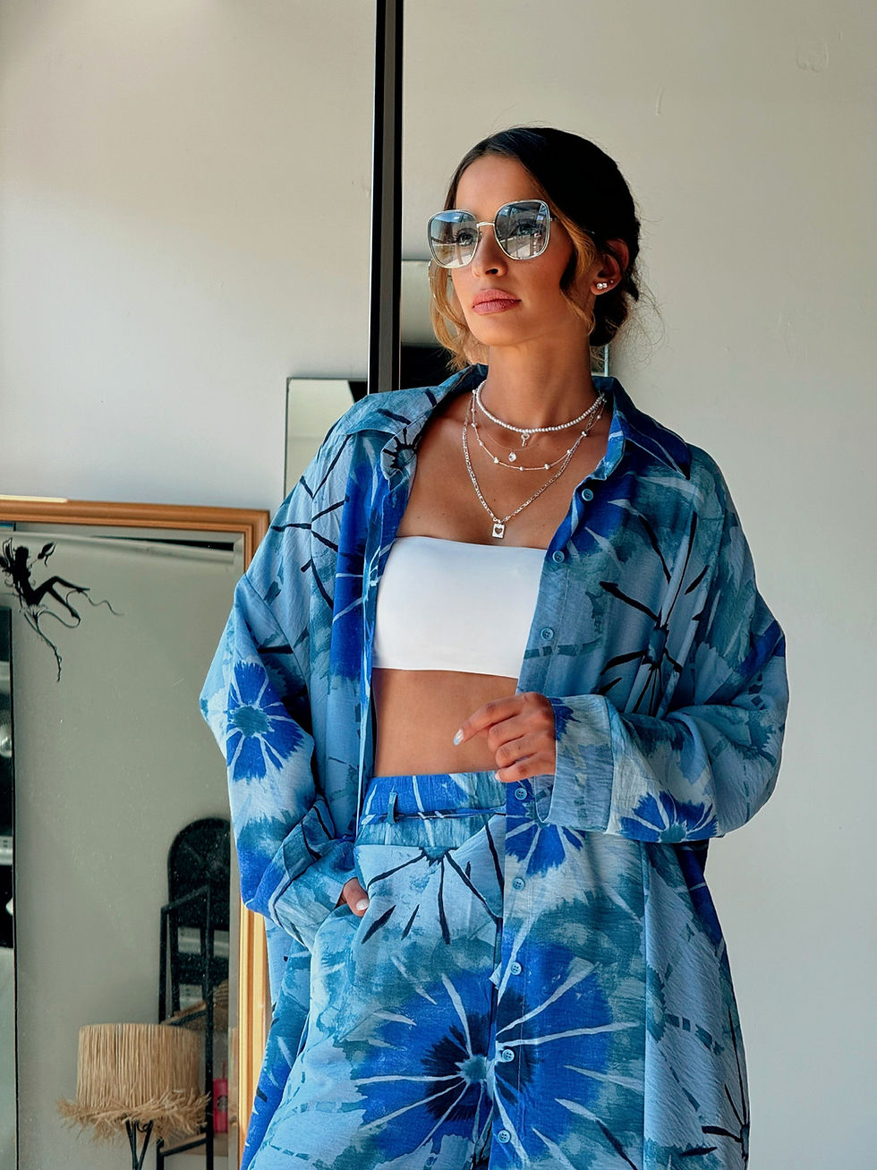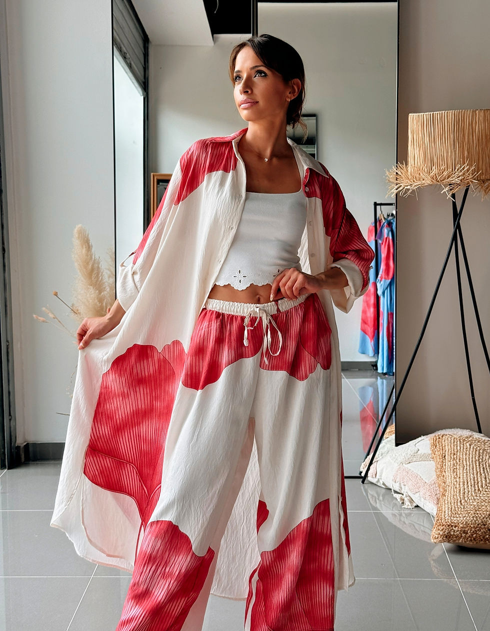 Ensemble satiné ultra-fluide. La veste à manches longues se distingue par sa fermeture zippée et son lien de serrage raffiné. Le pantalon, doté de poches discrètes sur les côtés et d'une ceinture élastiquée, allie confort et élégance.